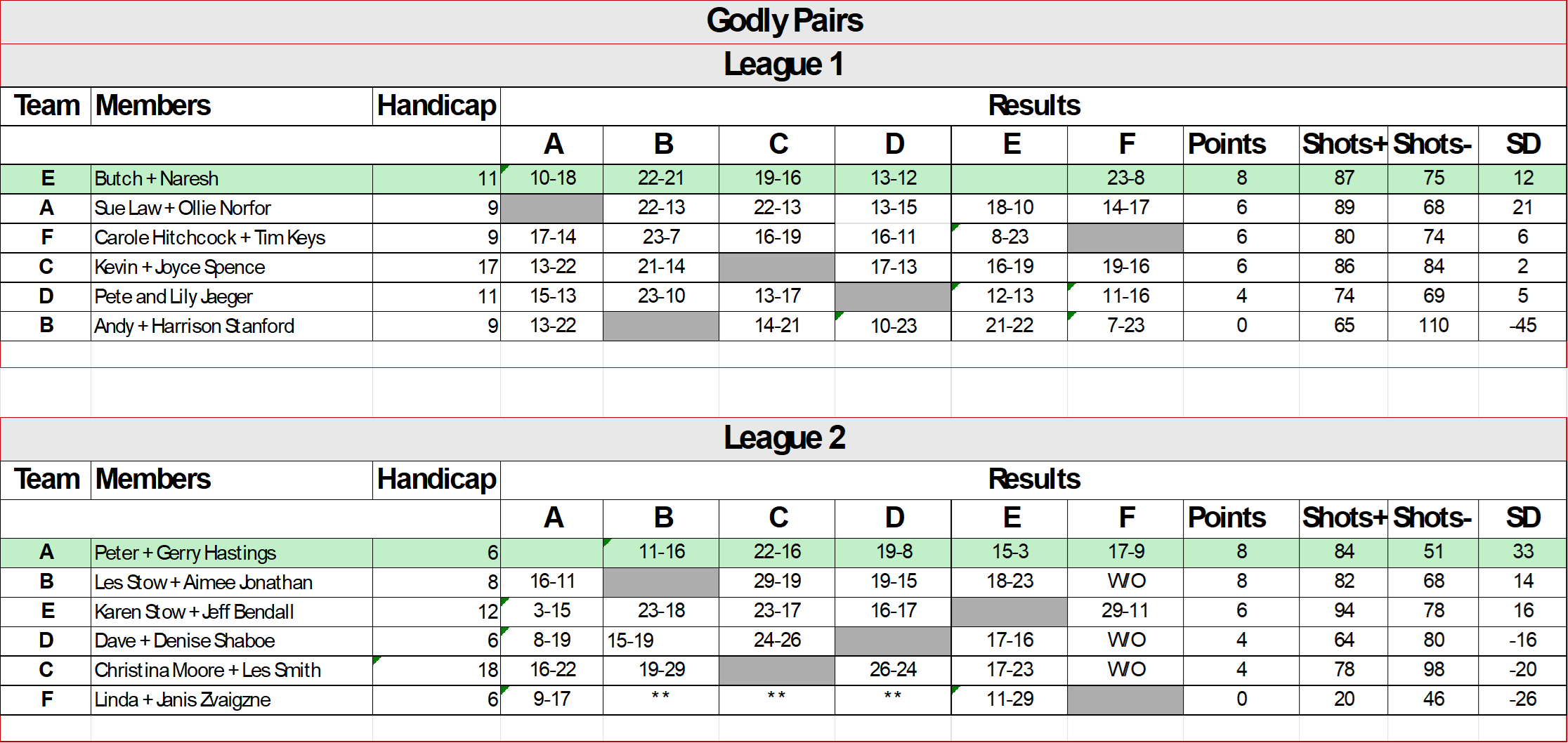 Pairs competition of 16 ends 4 bowls in 2 leagues. League winners play each other in the final. Teams arrange their own match times.